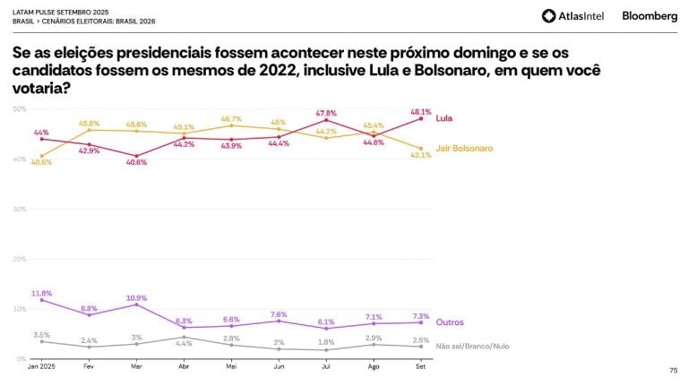 Apesar de condenado e inelegível, o ex-presidente Jair Bolsonaro (PL) aparece em um terceiro cenário testado pela AtlasIntel. A candidatura – que terá dificuldades políticas e jurídicas para sair do papel – aparece quando o levantamento questiona eleitores sobre o voto em 2026 se os candidatos fossem os mesmos de 2022.