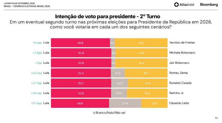 O levantamento sobre 2026, por fim, monitorou sete cenários de segundo turno entre Lula e outro candidato da direita. O petista, segundo a pesquisa, venceria todos os adversários com certa facilidade. Veja os resultados: